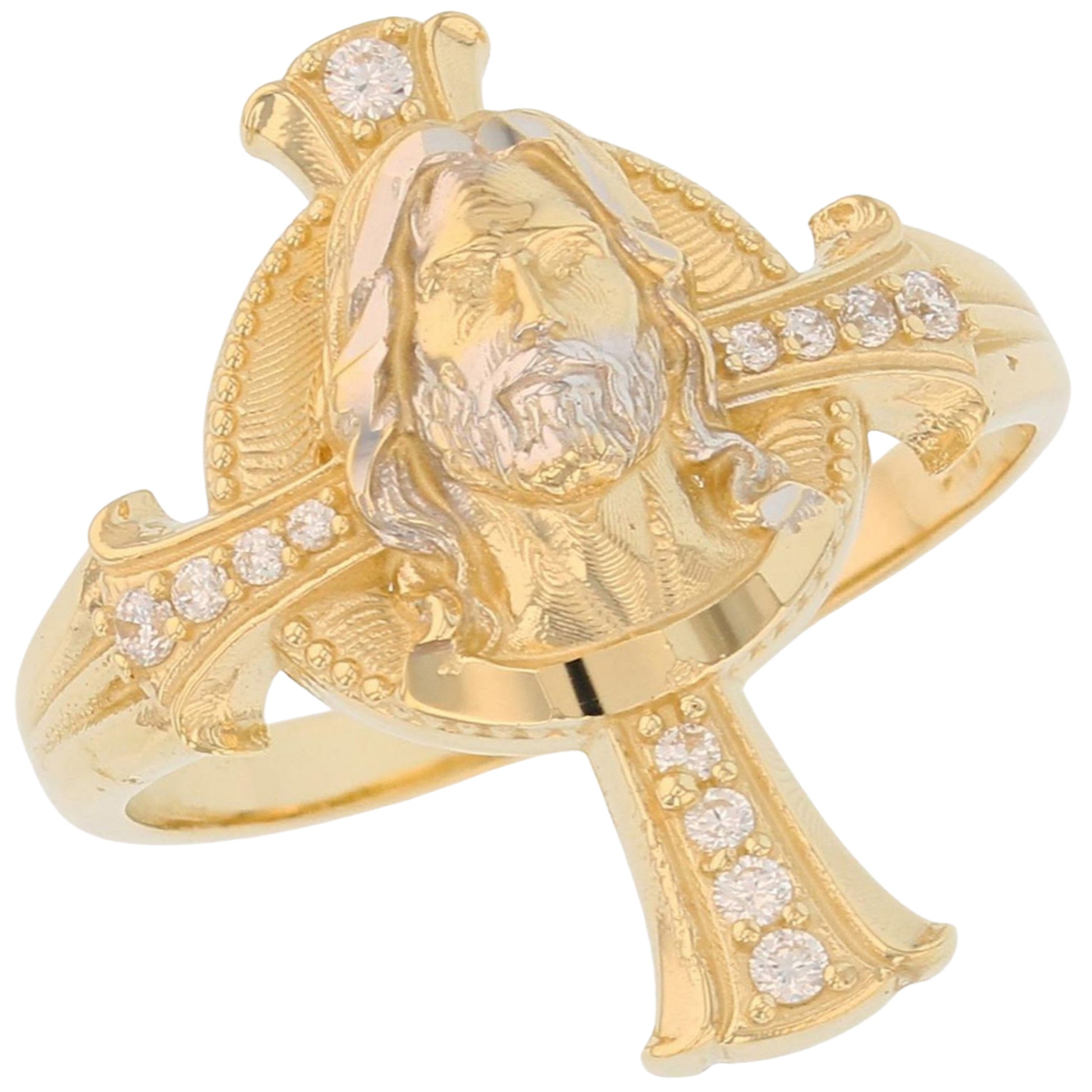 Add a touch of spirituality and style to your everyday look with this stunning 10k Two Tone Gold Cross with Jesus White CZ Mens Diamond Cut Religious Ring. Made in the US in a California based factory by the renowned brand emgeedi, this ring features a beautifully crafted cross with intricate detailing and sparkling White CZ stones. The ring is set with a total of 8 round shaped Synthetic White White CZs, adding a touch of elegance and sophistication to the design. Perfect for everyday wear or special occasions, this religious ring is a must-have addition to any man's jewelry collection.