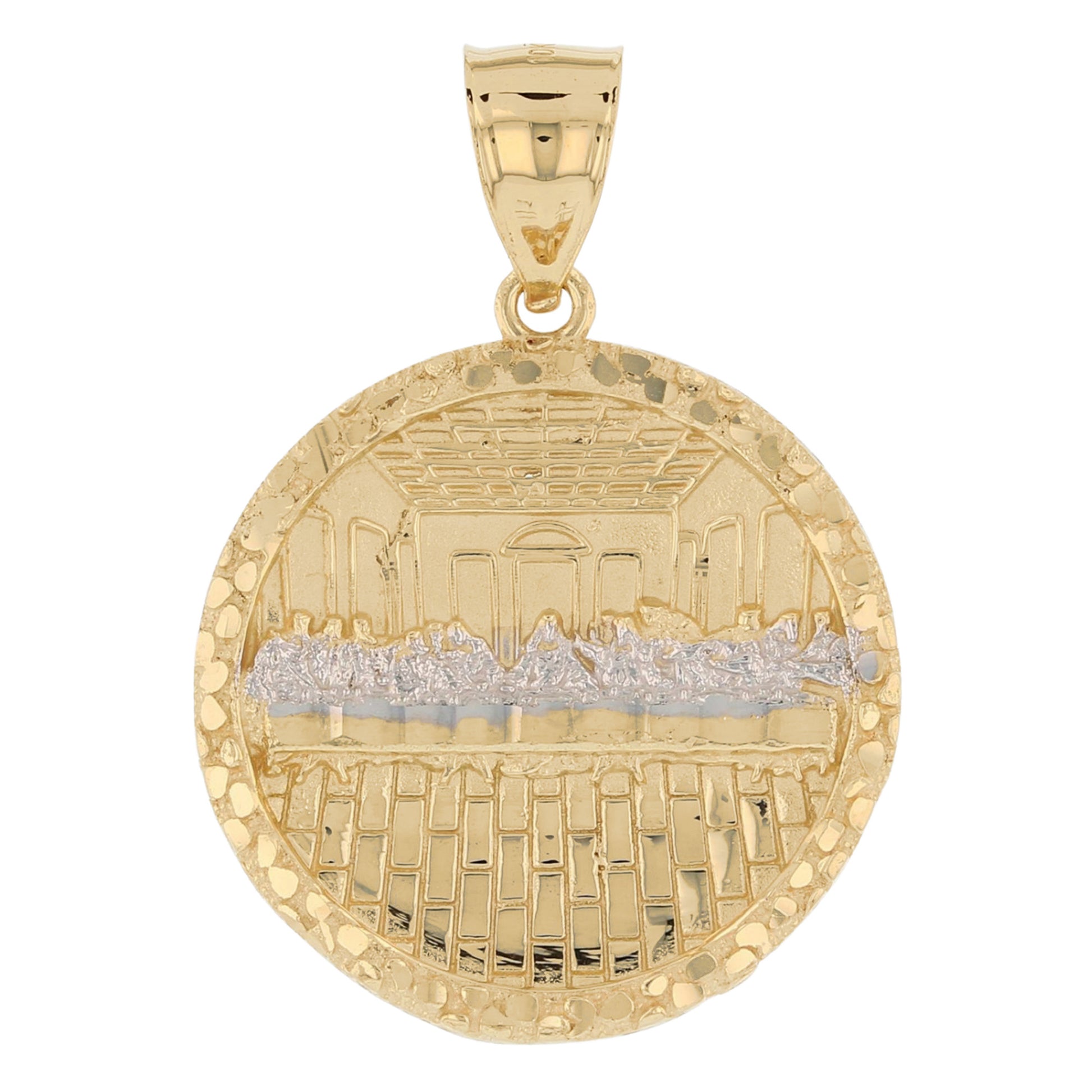 Introducing the exquisite 10k Two Tone Gold Small Round Last Supper Mens Diamond Cut Nugget Religious Jesus Pendant by emgeedi. Handcrafted in the US in a California based factory, this stunning pendant features intricate detailing of the Last Supper scene in a small round design. Made of high-quality 10k Two Tone Gold, this religious pendant is beautifully diamond cut for added sparkle and shine. Perfect for any religious man looking to showcase their faith in a stylish and meaningful way. Order yours today and add a touch of elegance to your everyday look.